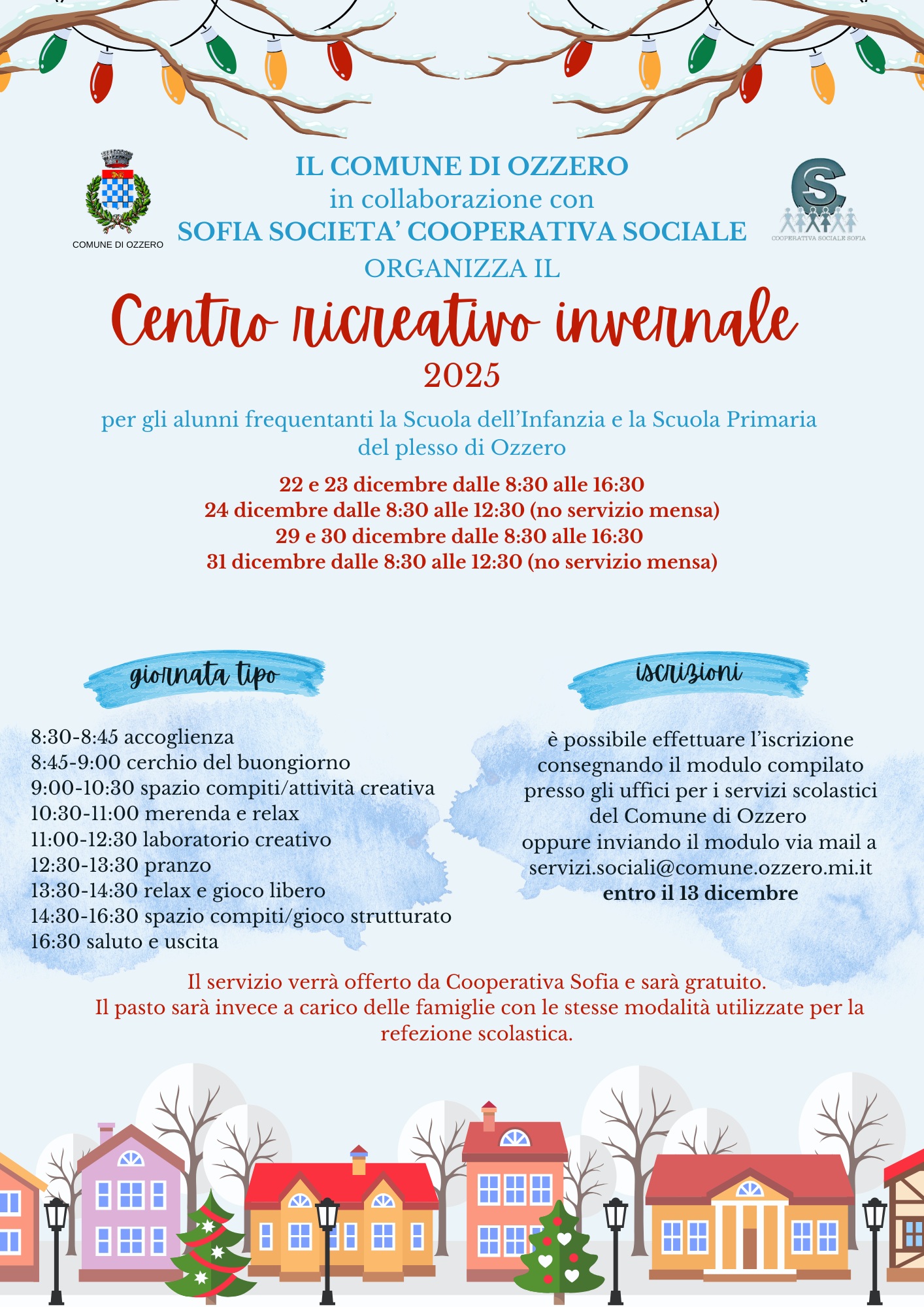 organizza il Centro ricreativo invernale 2025 per gli alunni frequentanti la Scuola dell’Infanzia e la Scuola Primaria del plesso di Ozzero. Il Centro si svolgerà nei seguenti giorni ed orari:
