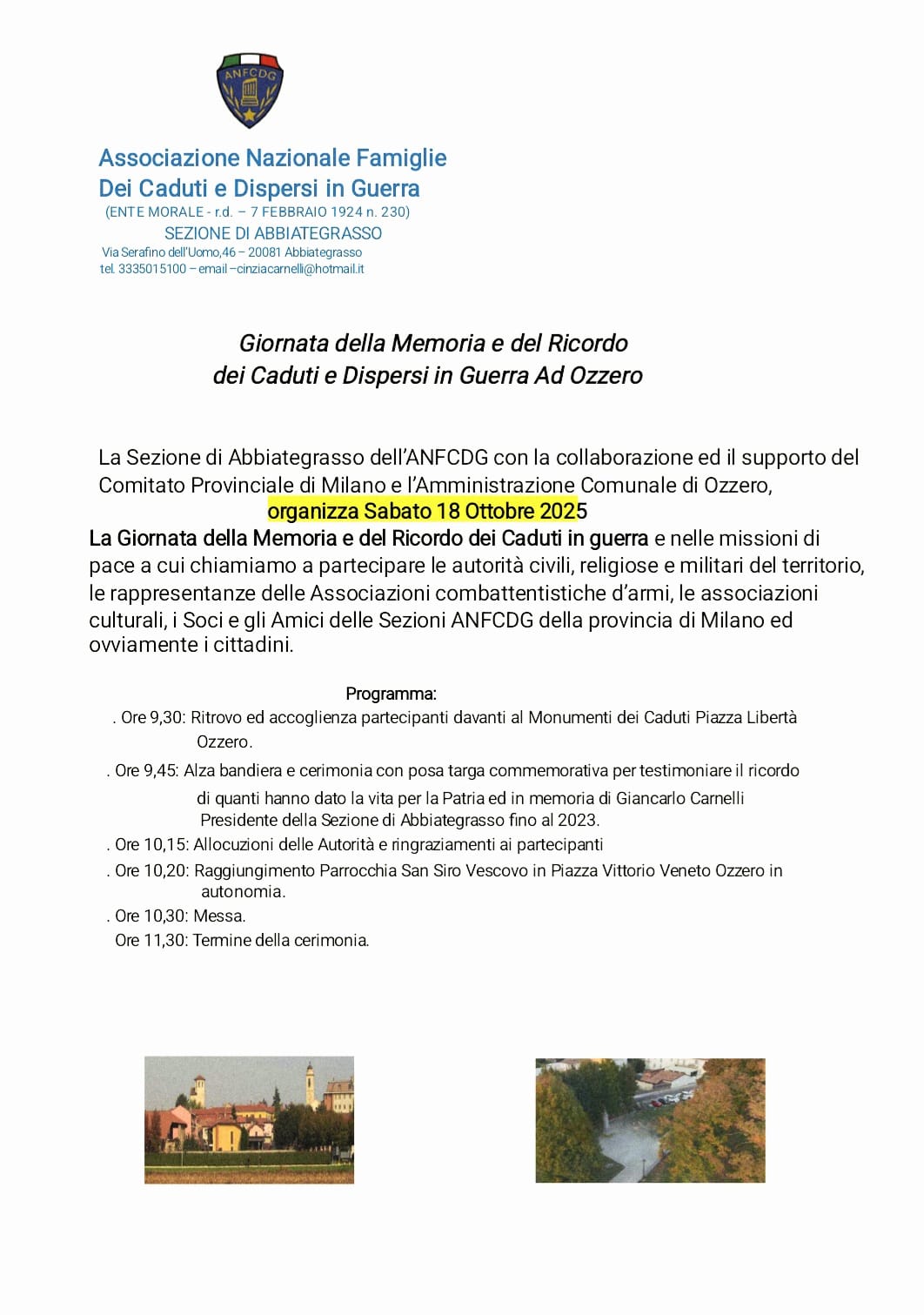 La Sezione di Abbiategrasso dell'ANFCDG con la collaborazione del Comitato Provinciale di Milano e l'Amministrazione Comunale di Ozzero organizza la Giornata della Memoria e del Ricordo dei Caduti e Dispersi In Guerra.