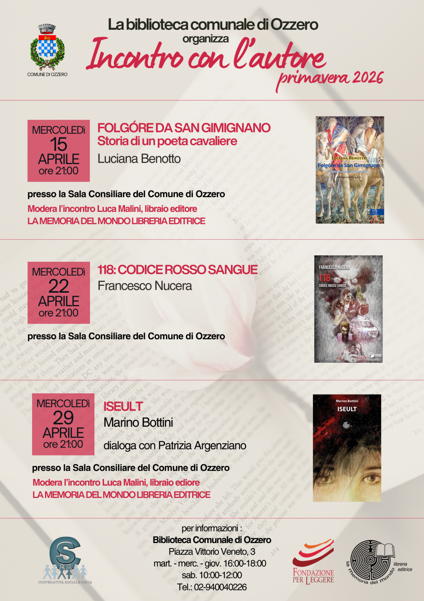 La Biblioteca comunale di Ozzero organizza "INCONTRI CON L'AUTORE" presso la sala consiliare del Comune di Ozzero:
