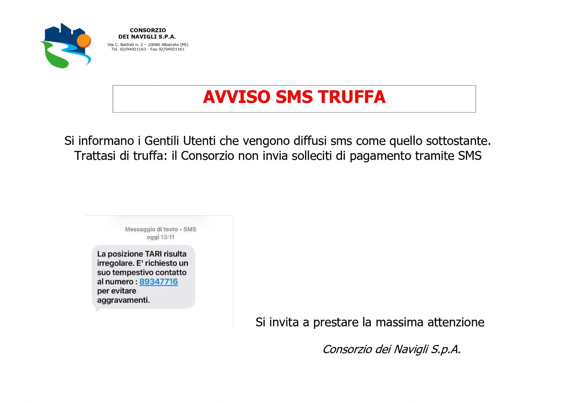 IL CONSORZIO DEI NAVIGLI S.P.A. NON INVIA SOLLECITI DI PAGAMENTO tramite SMS